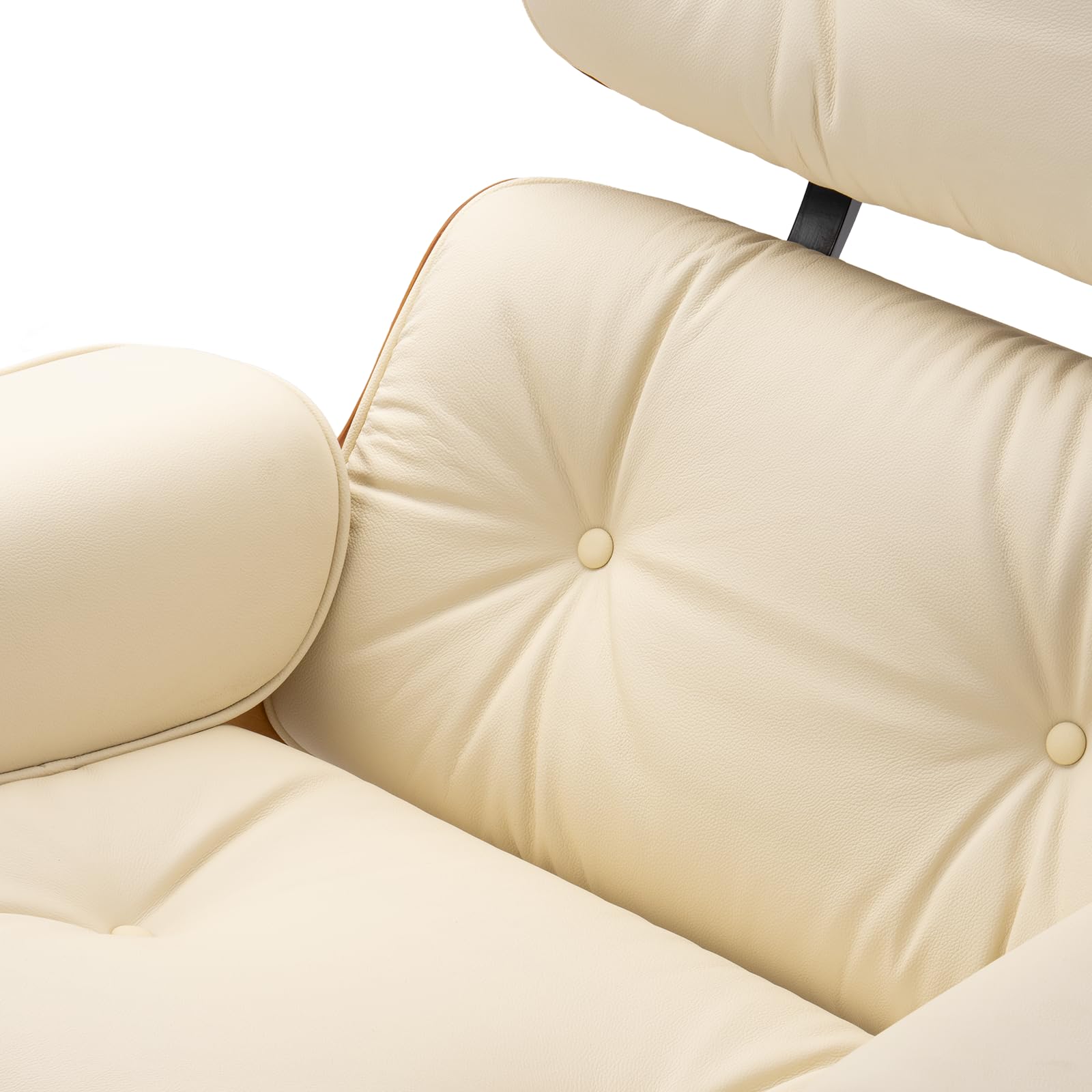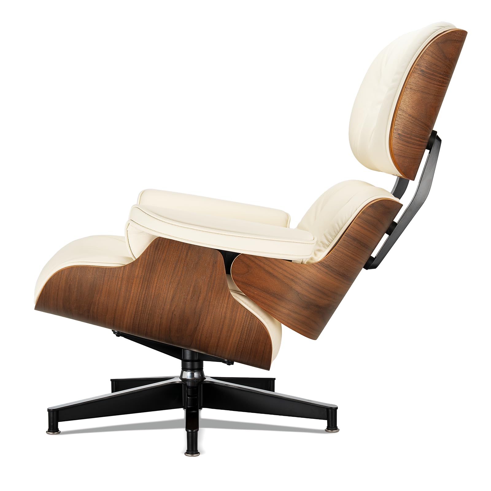 Chaise Lounge Chair with Ottoman Genuine Leather High-Resilience Foam Cushions Mid Century Modern Ergonomic Design for Living Room Study Lounge Office Walnut Ivory White