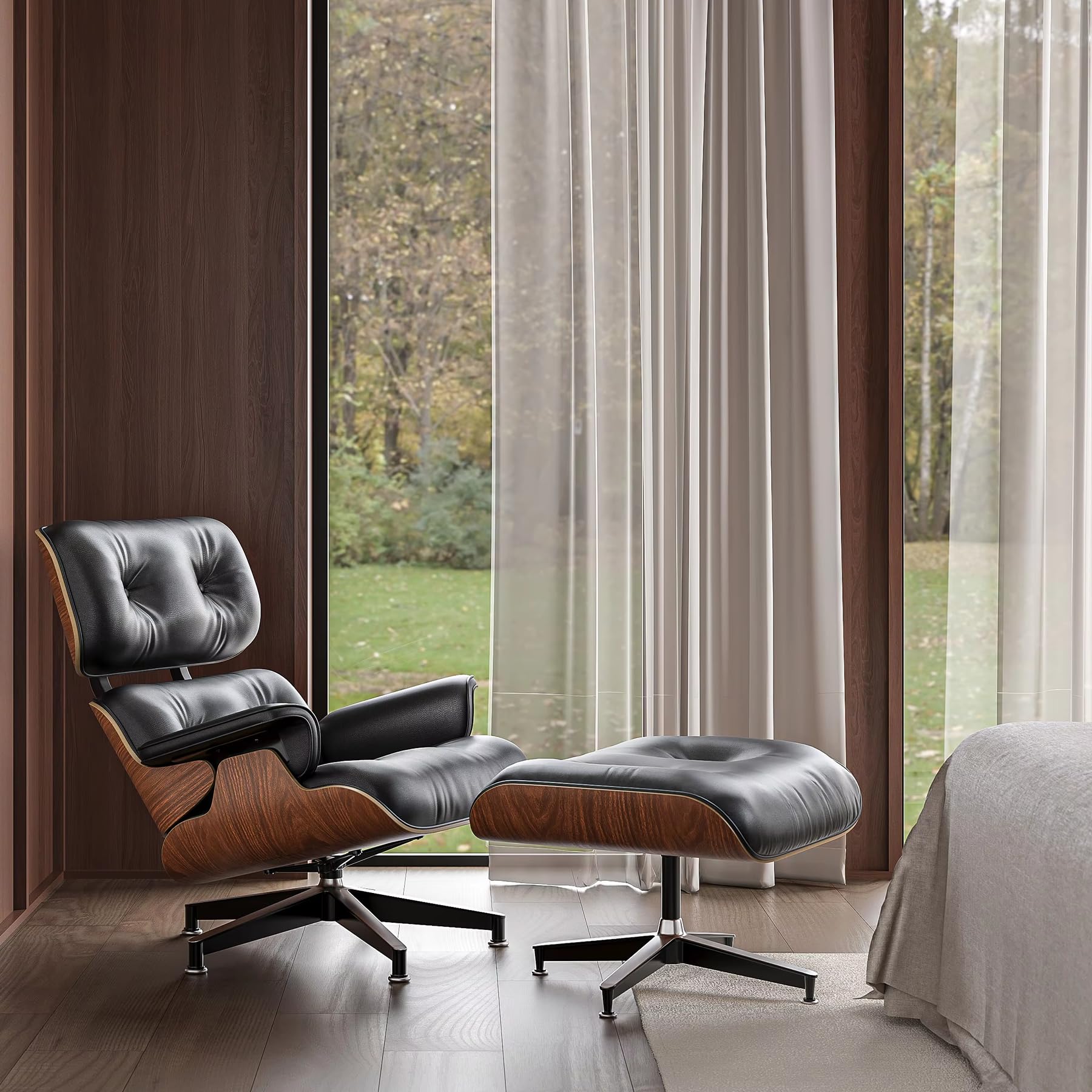 Top Black Grain Leather, Mid Century Chaise Lounge Chair and Ottoman, Modern Chair Classic Design, Heavy Duty Base Support for Living Room Study Lounge Office, Palisander Heightening