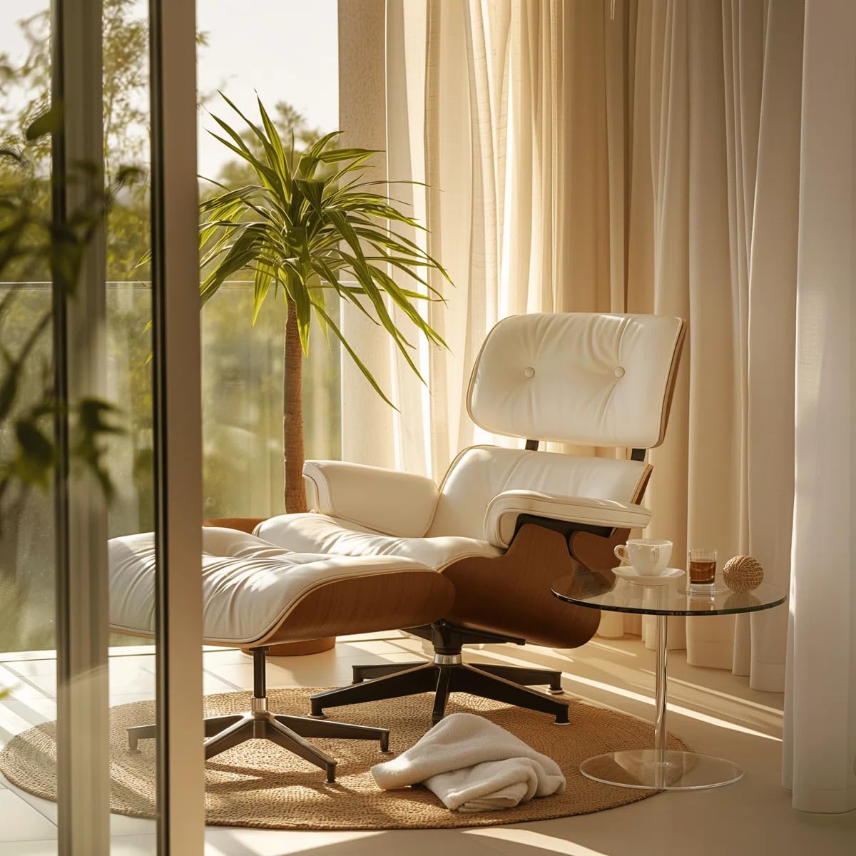 Top Grain Leather, Mid Century Chaise Lounge Chair and Ottoman, Modern Chair Classic Design, Heavy Duty Base Support for Living Room Study Lounge Office, Walnut-White, Heightening