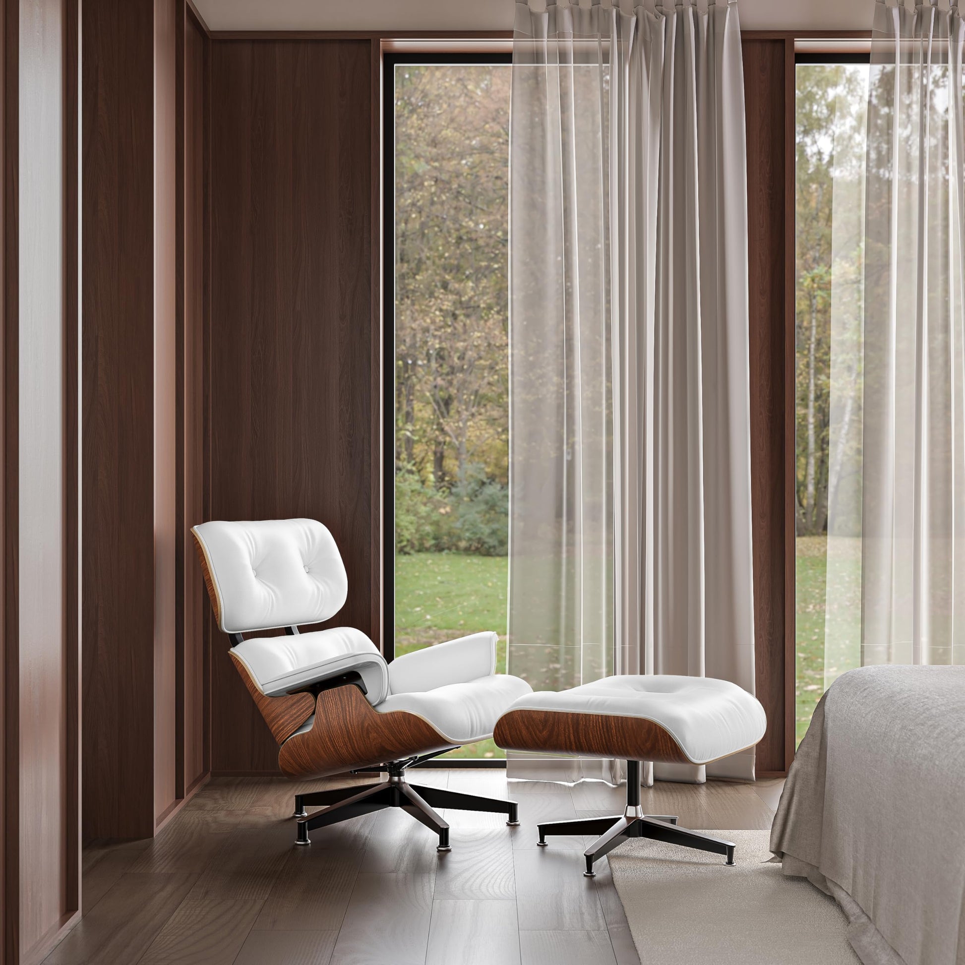 Chaise Lounge Chair with Ottoman Premium Aniline Leather Top Grain Leather High-Resilience Foam Cushions Mid Century Modern Ergonomic Design for Living Room Study Lounge Office Walnut White
